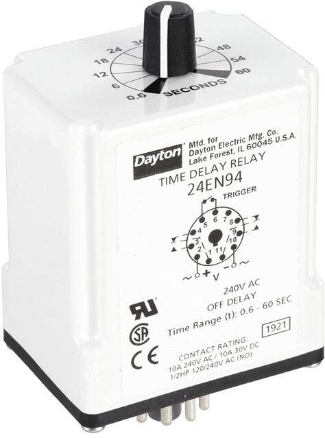 Dayton Single Function Time Delay Relay: Socket Mounted, 240V AC, 10 A, 11 Pins/Terminals, Off Delay Model: 24EN94