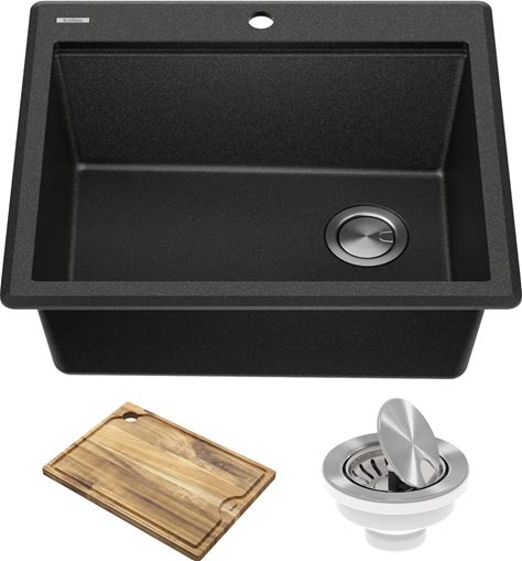 Kraus KGTW12-25 Bellucci 25" Drop In Single Basin Granite Composite Kitchen Sink With Basket Strainer And Cutting Board Metallic Black Sinks Kitchen