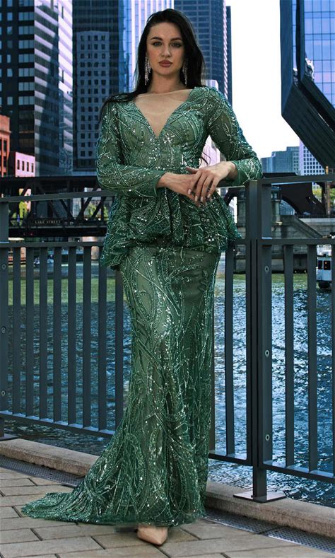 MNM COUTURE M1140 - Long Mesh Mermaid Dress - Long Sleeves, Illusion V-Shaped Inset, Peplum Waist Detail, Open Back, Sweep Train 22 / Green - Shop MNM