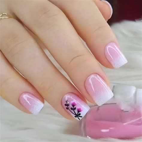 Pink Press On Nails Short Square Flower Fake Nails With Designs Cute False Nails Gradient White Pink Gel Acrylic Nails Short French Glue On Nails