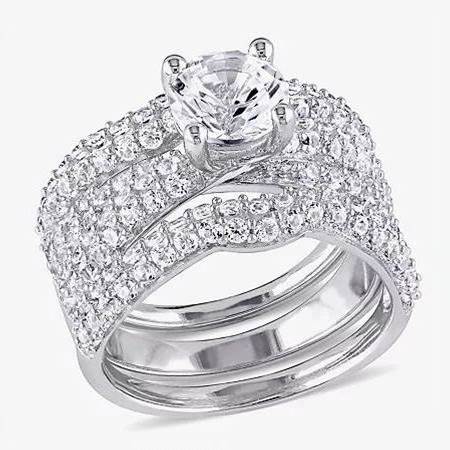 Modern Bride Gemstone Womens Lab Created White Sapphire Sterling Silver Round Bridal Set | 9 | Rings Bridal Sets