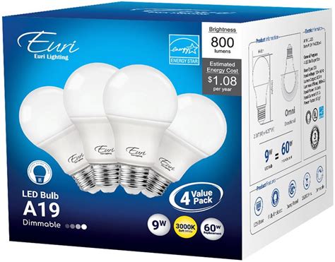 Euri Lighting A19 LED Bulb - 9W - E26 Base - Dimmable - 60W Incandescent Equivalent - 4-Pack - 3000K - EA19-6000E-4