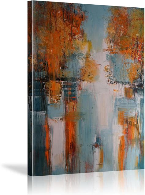 Abstract Landscape Canvas Wall Art - Modern Orange Blue Grey Textured Painting, Tree & Lake Painting Reflection Prints Poster Art For Living Room