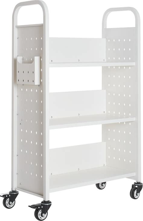 UIMOSO Rolling Library Book Cart, Double Sided L-Shaped Shelves With Lockable Wheels, Book Truck For Home Shelves Office Steel In White